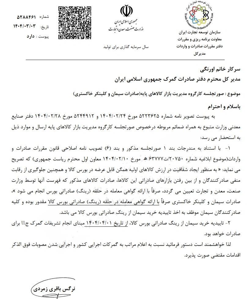 بر این اساس سازمان توسعه تجارت صورتجلسه کارگروه مدیریت بازار کالاهای پایه (صادرات سیمان و کلینکر خاکستری) را به بورس کالا و گمرک ایران ابلاغ کرد که مطابق آن از یکم تیرماه امسال، تأییدیه خرید سیمان از رینگ صادراتی بورس کالا مبانی تشریفات گمرکی خواهد بود.